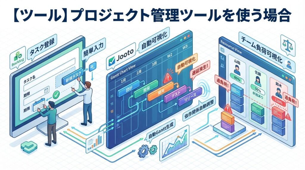 BacklogやJootoでは、タスク名と期限を入力するとガントチャート表示に切り替えられます。タスク同士を矢印で結ぶと、前の作業が2日遅れた場合に後続タスクも自動で2日後ろへ移動します。担当者別に表示を切り替えると、誰に作業が集中しているかを画面で確認できます。