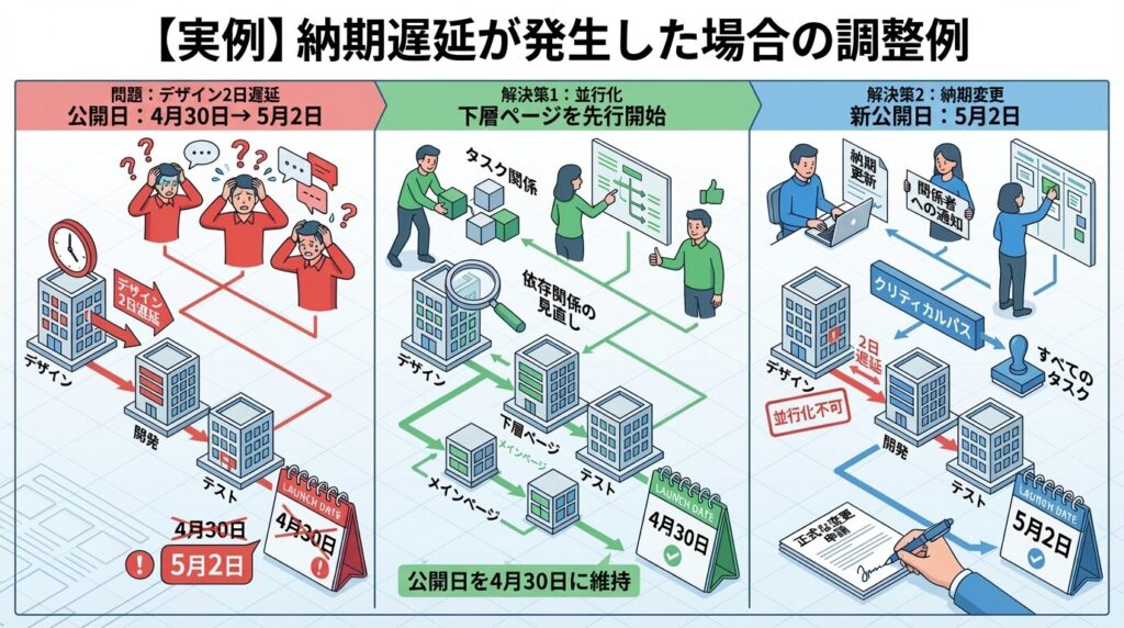 デザインが2日遅れた場合、トップページ以外の下層ページ実装を先に始められないかを確認します。依存関係を見直し、先行できるタスクを並行に変更すると、公開日を4月30日に戻せる可能性があります。すべての工程が直列でつながっている場合は、公開日を5月2日に変更する判断が必要になります。