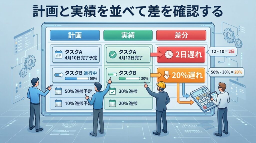 スケジュールを作るだけでは、プロジェクトは予定どおりには進みません。重要なのは、実際の進み具合を定期的に確認し、計画との差を把握しながら軌道修正していくことです。ここでは、計画と実績をどう比較するのか、遅れの原因をどの工程で見つけるのか、そして出来高やEVMといった数値指標を使って進捗を測る基本的な方法を順に整理します。
