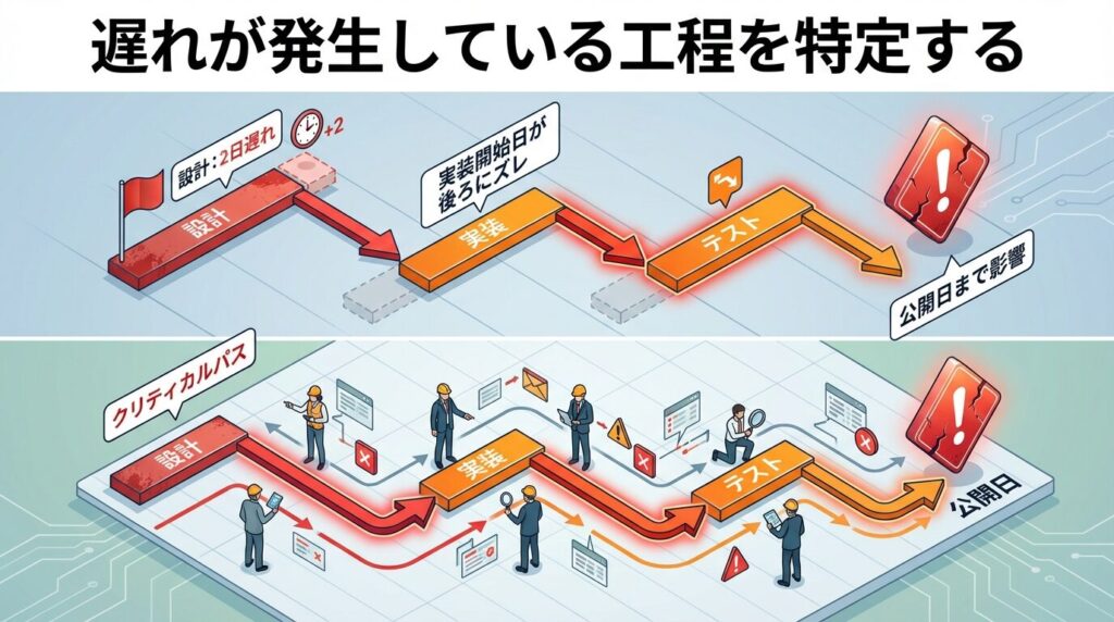 遅れているタスクの中から、後続タスクと矢印でつながっている工程を確認します。たとえば設計が2日遅れている場合、実装の開始日が後ろにずれていないかをチェックします。ガントチャートで直列につながるバーをたどると、公開日まで影響する工程を特定できます。