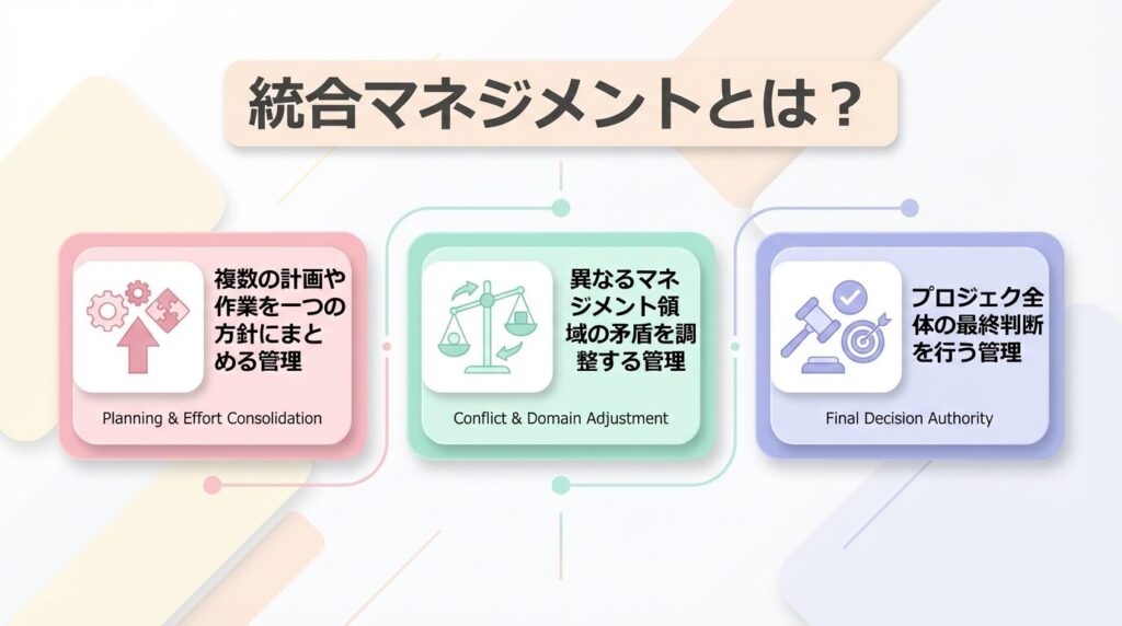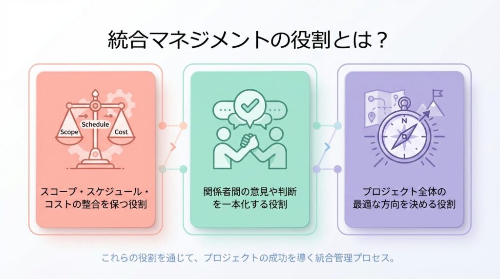 統合マネジメントは、個別に進む作業や判断をバラバラのままにせず、プロジェクト全体として矛盾なく動かすための調整機能です。スコープ・スケジュール・コストの食い違いを防ぎ、関係者の意見の衝突を整理し、最終的にどの方向で進めるかを決定します。ここでは、プロジェクトを破綻させないために統合マネジメントが担う具体的な役割を確認します。