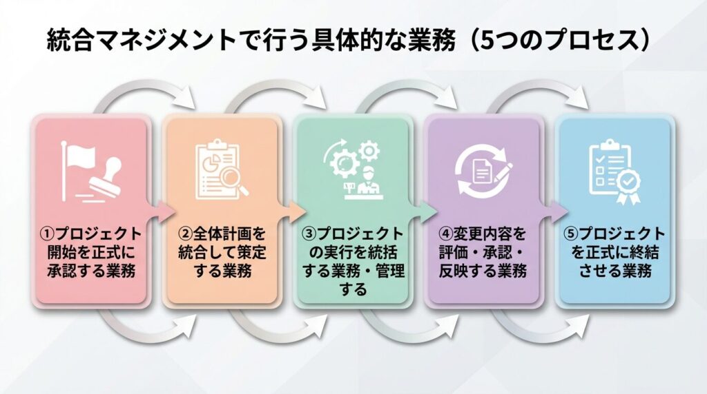 統合マネジメントでは、プロジェクトを「立ち上げて終わらせるまで」の全工程を横断的に管理します。個々の作業を単に進めるのではなく、開始の承認から計画策定、実行の統括、変更対応、そして正式な終結までを一貫した流れとして統合することが重要です。ここでは、統合マネジメントで実際に行われる主要な5つの業務プロセスを順に確認します。