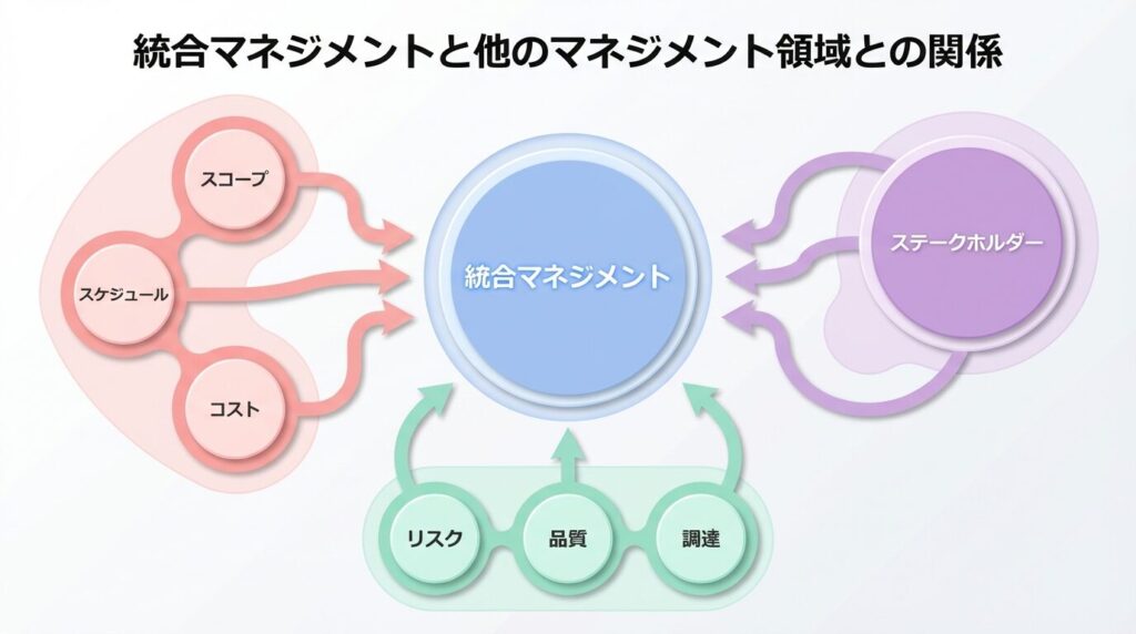 統合マネジメントは、単独で機能するものではなく、スコープ・スケジュール・コスト、リスク、品質、調達、ステークホルダーなど、すべてのマネジメント領域を横断して結び付ける役割を担います。各領域が個別に最適化されても、全体として整合が取れていなければプロジェクトは成功しません。ここでは、主要なマネジメント領域と統合マネジメントがどのように関係し、全体最適を実現しているのかを整理します。