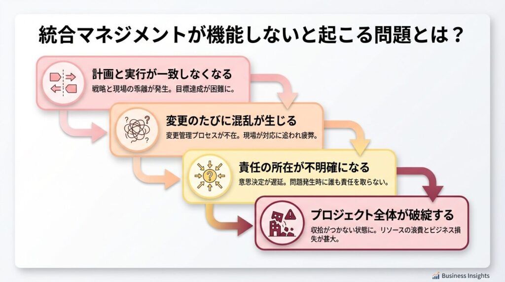 統合マネジメントが十分に機能しない場合、個々の作業や判断がバラバラに進み、プロジェクト全体の整合性が失われます。その結果、計画と実行のズレや変更時の混乱、責任の不明確化などが連鎖的に発生し、最終的にはプロジェクトの失敗につながる可能性も高まります。ここでは、統合マネジメントの欠如によって具体的にどのような問題が起こるのかを確認します。